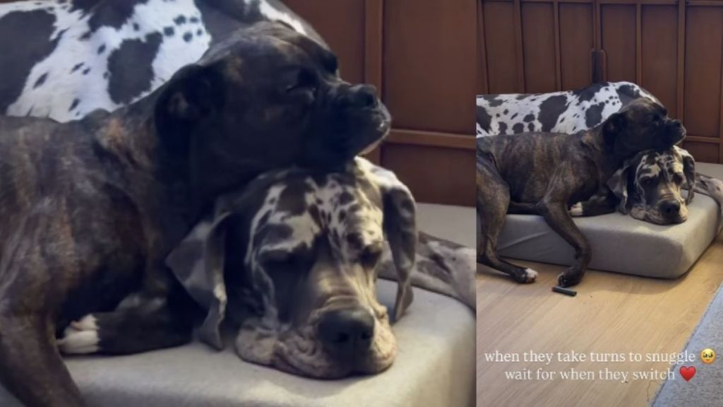 The clip uploaded on @k_and_mae shows the two pups snuggling with each other most sweetly. The reel shows the furry siblings, Khloie and Mae, lying on their bed, with Mae placing his head on Khloie’s head. Not once do they fight or bark at each other for sharing the bed. While the owner thought the blue harlequin great dane and the brindle boxer would sleep in the same position, they “switch,” taking “turns to snuggle,” leaving the pet parent smitten by their bonding and asking the netizens, “which way looks comfier?”