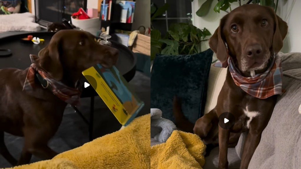 This video of a dog’s book time is quick and cute. This one feels like a real wind-down. In this cozy storytime clip, Renegade, or Ren, ends the night by bringing a children’s book to the couch. She settles into a mustard-yellow blanket and watches her mom read like she understands every line. It’s a simple routine, but it lands big because it looks like comfort on repeat.