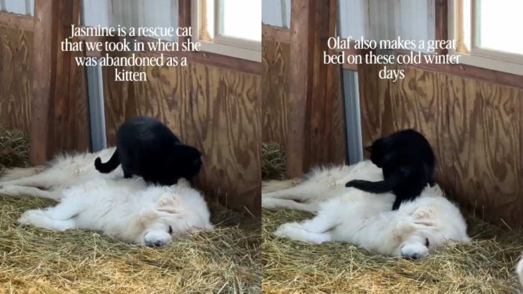 While the guardian dog lies down comfortably in the barn, trying to sleep, the rescue cat named Jasmine does her best to make his naptime better in the sweet video. She begins gently massaging the pup, and he clearly enjoys it.