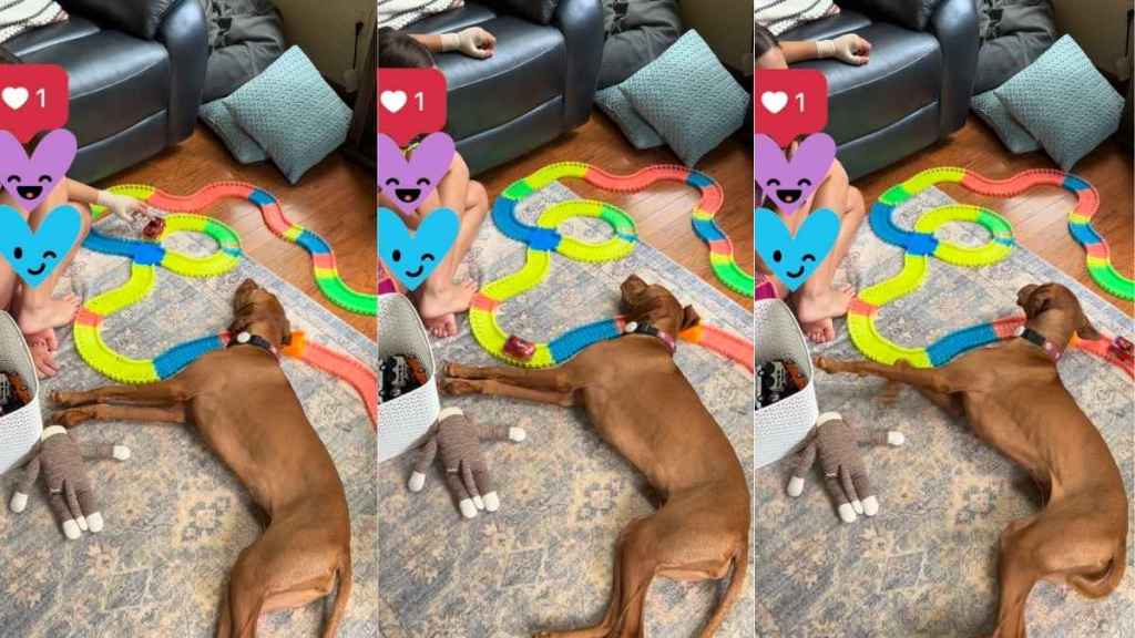Meanwhile, Ruby appears to be the biggest obstacle lying on the track. She has rested her neck over a small passage of the track, which can ruin the race. However, the Vizsla smartly lifts her head whenever the car comes close to her, and as a result, the game continues flawlessly. Seeing her behavior leaves the kid and the owner in stitches. Their laughter can be heard in the dog and kid play video.