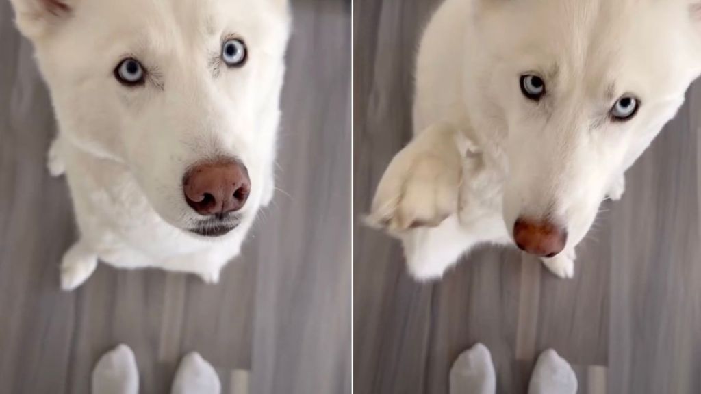 The recent clip of the Husky begins with a humorous text overlay that reads: “Wearing white socks and pants so no one can tell us apart.” The camera shows Ginkgo standing nearby while the owner reveals an outfit that mirrors the dog’s snowy appearance. White pants and white socks perfectly match the Husky’s bright fur.