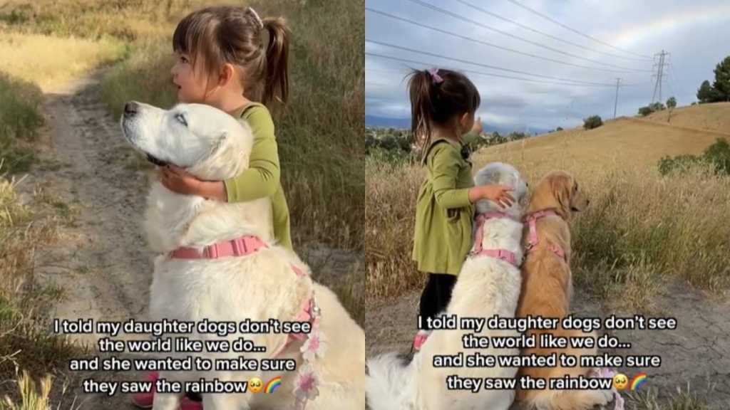 Still, that doesn’t make their experiences any less meaningful. A recent video captures this idea in a simple yet emotional way, as a little girl tries to share the beauty of a rainbow with her dogs.