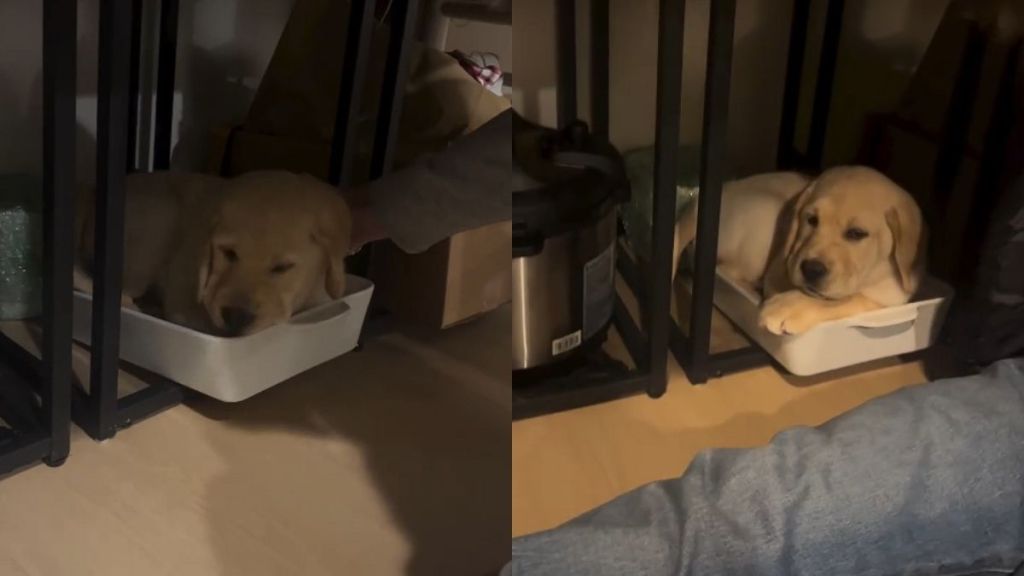 In the video, the Labrador puppy curls himself into a white casserole dish under a table. It looks like he reserved it to stay away from chaos and rest peacefully, and he actually looks quite settled, with the video’s caption explaining, “He wanted to take a nap in our casserole dish.”